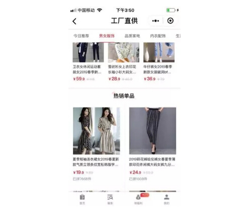 易亚电商了解到,目前京东拼购工厂直供的商品品类包括男女服饰、品质家电、内衣配饰、生活百货、时尚鞋包、数码办公、休闲食品、家纺家装、美妆个护,商品价格都非常低。以男女服饰品类为例,京东拼购工厂直供的商品价格在十几块到几十块不等。